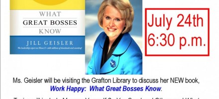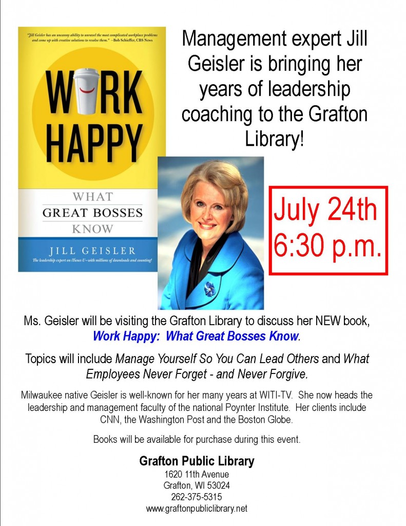 “WORK HAPPY: WHAT GREAT BOSSES KNOW” Book Talk at the Grafton, WI Library – July 24