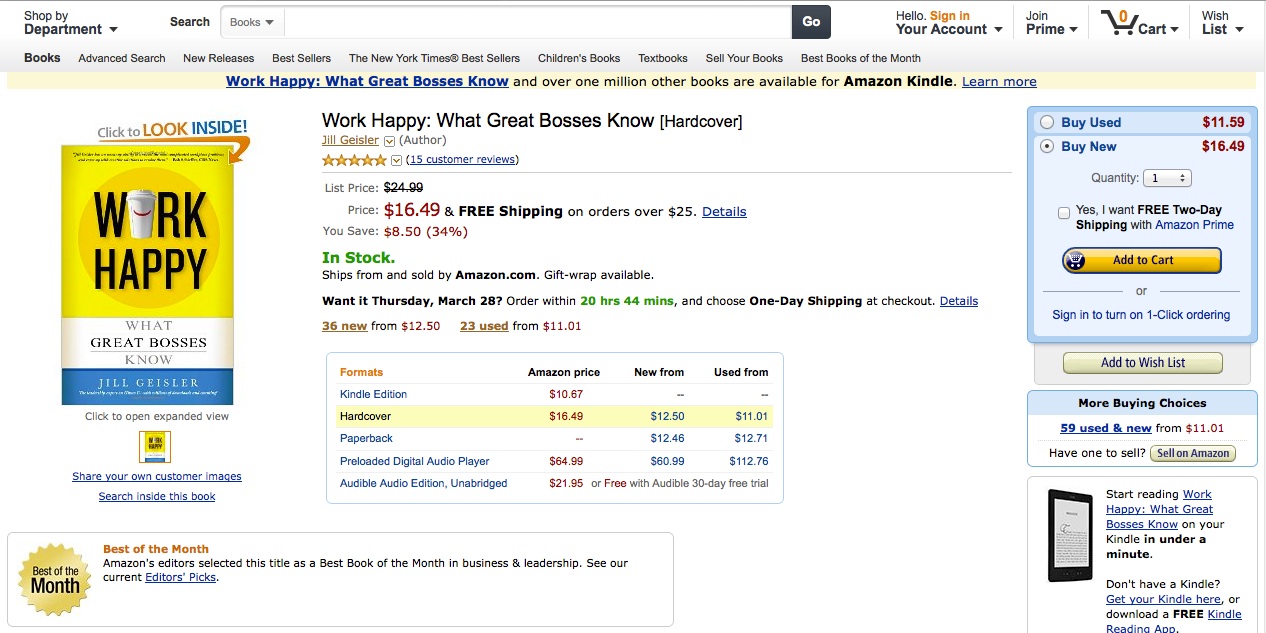 Thanks to Amazon for the wonderful distinction. Again, feel free to browse the "Best of the Month" page for other titles you might enjoy -- along with "WORK HAPPY: WHAT GREAT BOSSES KNOW."More About Amazon.com's Best Books of the Month